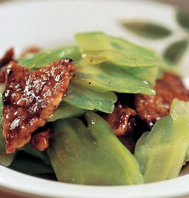 3. 锅中余油加热,放入苦瓜翻炒数下,加入肉片和豆豉,大火炒匀,再加蚝油、高汤、盐、细砂糖、味精及酱油,改小火焖2 分钟即可。